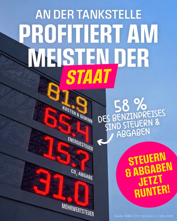 Hohe Preise an der Zapfsäule? Ein wesentlicher Kostentreiber ist hier der Staat – weit über die Hälfte des Preises macht er aus. Und er verdient bei jeder Erhöhung mit. Das darf nicht sein. ➡️ Es ist an der Zeit, die Menschen in Deutschland, die jeden Tag auf das Auto angewiesen sind, spürbar zu entlasten. Wir müssen ran an Steuern und Abgaben.